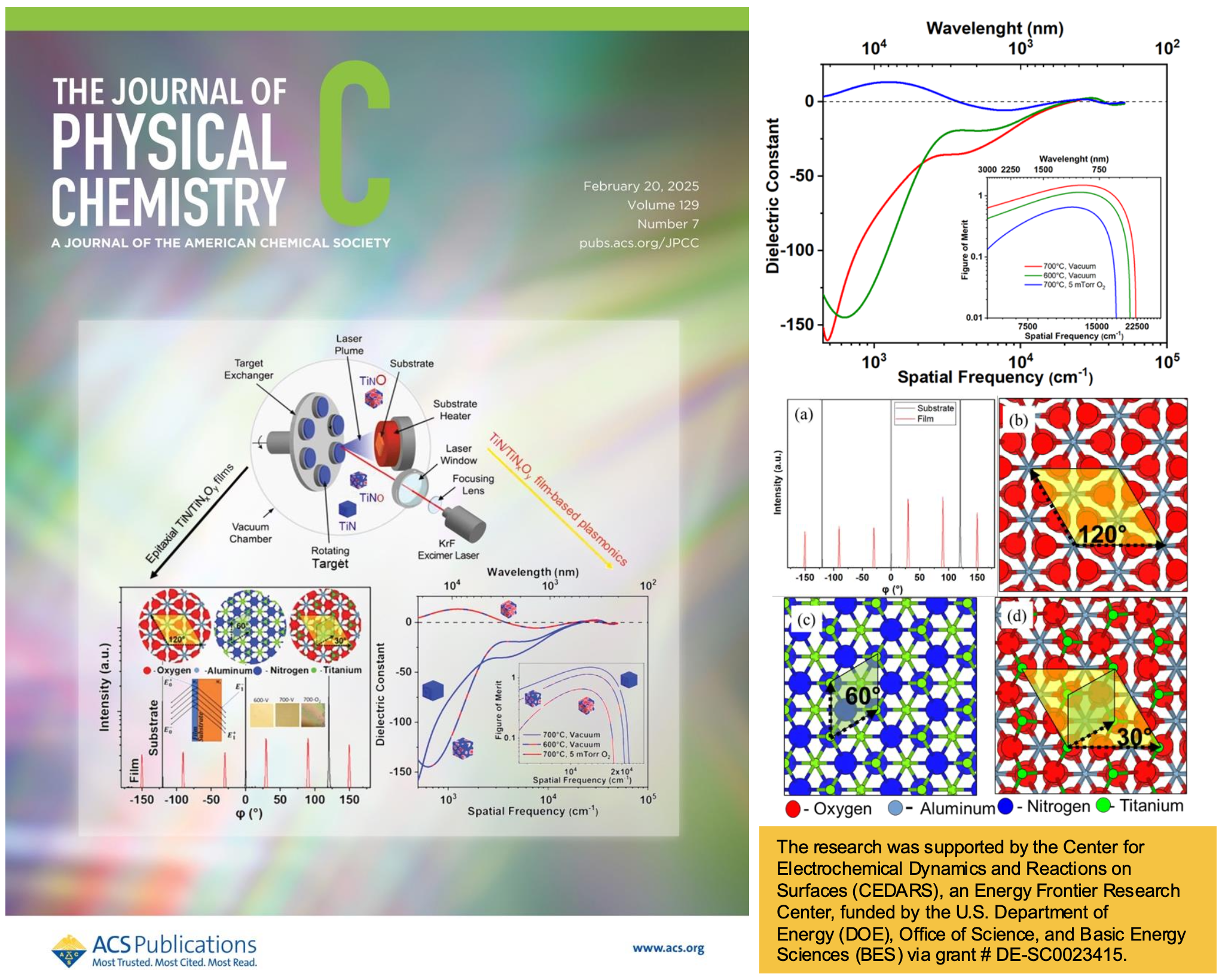 Pulsed laser deposition (PLD) assisted fabrication of epitaxial titanium nitride (TiN) and titanium oxynitride (TiNO) thin films with noble metal-like reflectivity, large negative dielectric constant, and figure of merit (top figure, middle panel). The optical properties of TiN and TiNxOy films are analyzed using a model of a thin film on a thick substrate involving air–film, film–substrate, and substrate–air interfaces. (J. Phys. Chem. Supplementary Cover, Feb 20, 2025, Vol 129, No. 9, Left panel)
